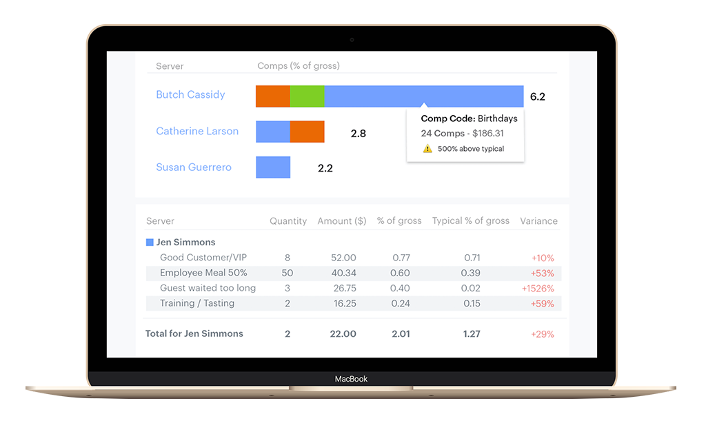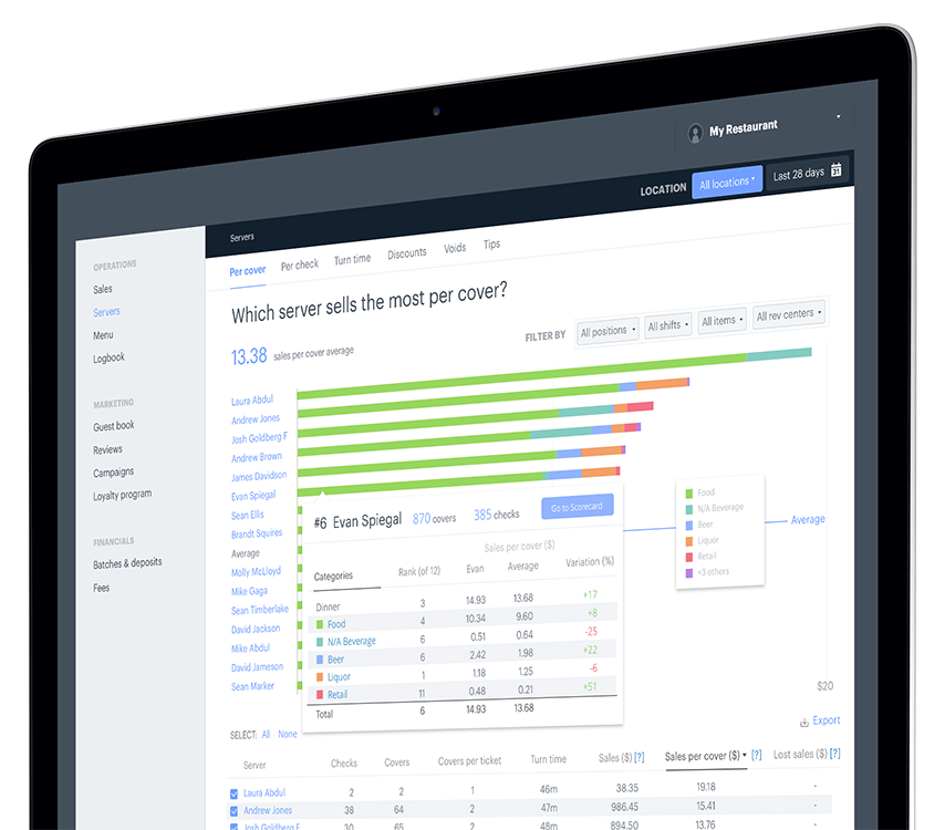 Provides a comprehensive scorecard on how your Front-of-house team is doing. See how the stars in your leader-board raise ticket sizes, turn more covers, and easily identify coaching opportunities to raise the level of those under-performing.